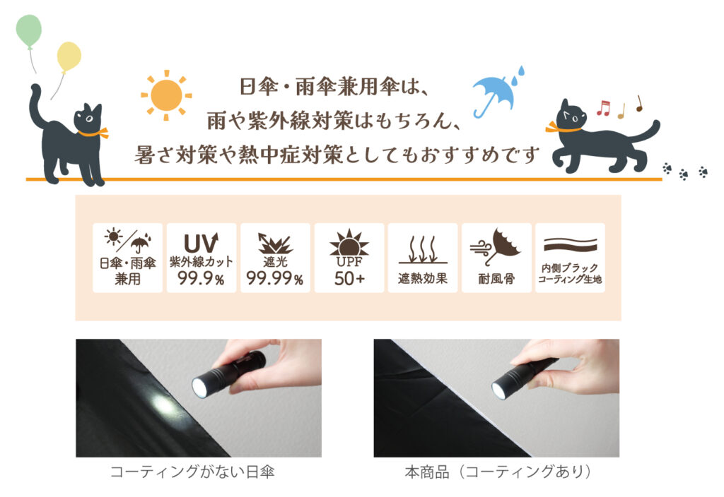 ・UVカット率99.9%、遮光率99.99%以上、UPF50+、遮熱効果